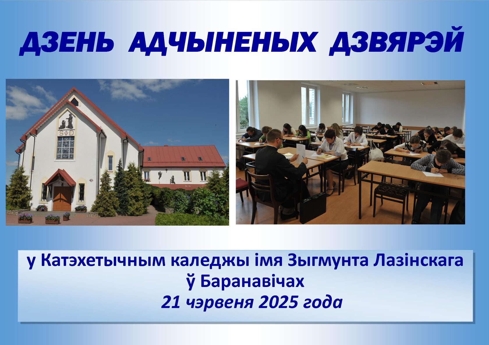 Катэхетычны каледж імя Зыгмунта Лазінскага ў Баранавічах сардэчна запрашае на “Дзень адчыненых дзвярэй” 21 чэрвеня 2025 года з 10:00 да 18:00 па адрасе: г. Баранавічы, вул. Т. Шаўчэнкі, 6 Дом Святой Тройцы